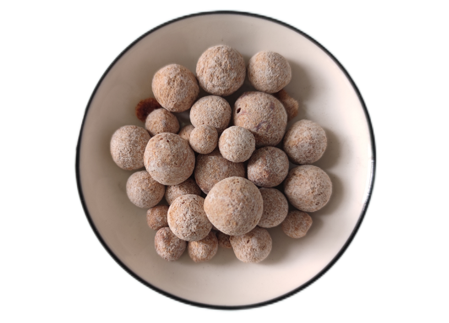 【性状】本品呈类球形。表面棕黄色或灰白色,附有白色粉末。体轻,质酥,易碎。断面中空或多孔状,淡黄色至棕色。气微,味微甜。