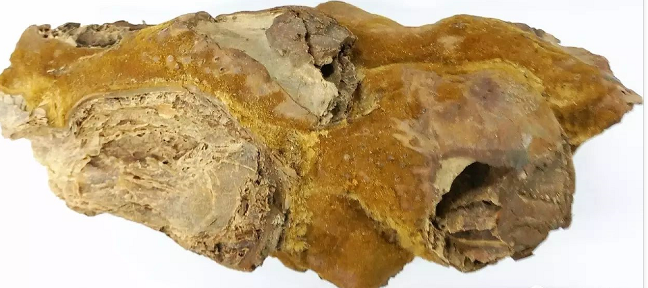 【性状】 本品呈不规则的长块状,长10~30cm,直径2~10cm。表面深棕色,残留金黄色绒毛;上面有数个红棕色的木质叶柄,下面残存黑色细根。质坚硬,不易折断。无臭,味淡、微涩。生狗脊片呈不规则长条形或圆形,长5~20cm,直径2~10cm,厚1.5~5mm;切面浅棕色,较平滑,近边缘1~4mm处有1条棕黄色隆起的木质部环纹或条纹,边缘不整齐,偶有金黄色绒毛残留;质脆,易折断,有粉性。熟狗脊片呈黑棕色,质坚硬。