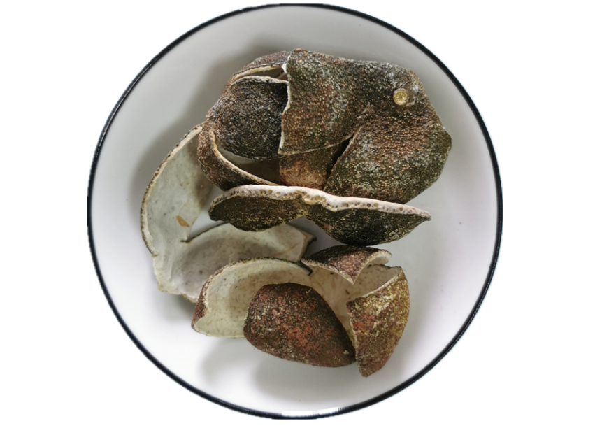 个青皮 呈类球形,直径0.5~2cm。表面灰绿色或黑绿色,微粗糙,有细密凹下的油室 ,顶端有稍突起的柱基,基部有圆形果梗痕。质硬,断面果皮黄白色或淡黄棕色,厚0.1~0.2cm ,外缘有油室1~2列 。瓤囊8~10瓣,淡棕色。气清香,味酸、苦 、辛。