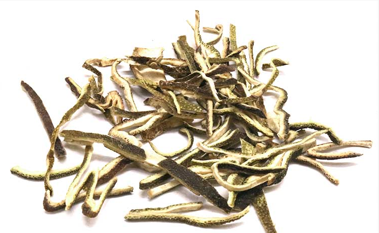 【饮片性状】本品呈类圆形厚片或不规则丝状。表面灰绿色或黑绿色,密生多数油室,切面黄白色或淡黄棕色,有时可见瓤囊8~10瓣 ,淡棕色。气香 ,味苦 、辛。