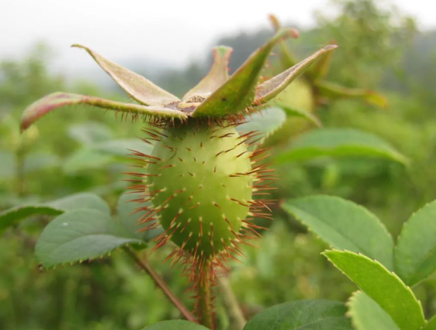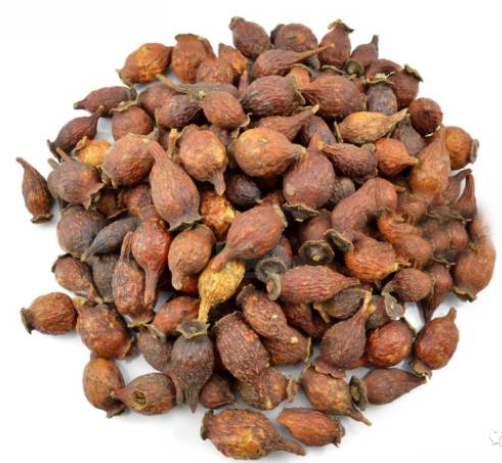 【性状】 本品为花托发育而成的假果 ,呈倒卵形,长2~3.5cm,直径1~2cm。表面红黄色或红棕色,有突起的棕色小点 ,系毛刺脱落后的残基 。顶端有盘状花萼残基 ,中央有黄色柱基 ,下部渐尖。质硬 。切开后,花托壁厚1~2mm,内有多数坚硬的小瘦果 ,内壁及瘦果均有淡黄色绒毛 。气微,味甘 、微涩。