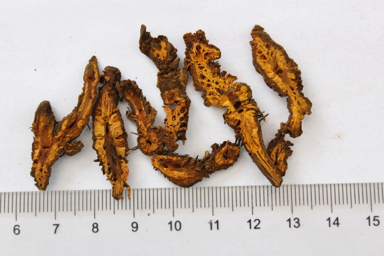 【性 状】味连 多集聚成簇,常弯曲,形如鸡爪,单枝根茎长3~6cm,直径0.3~0.8cm。表面灰黄色或黄褐色,粗糙,有不规则结节状隆起、须根及须根残基,有的节间表面平滑如茎秆,习称“过桥”。上部多残留褐色鳞叶,顶端常留有残余的茎或叶柄。质硬,断面不整齐,皮部橙红色或暗棕色,木部鲜黄色或橙黄色,呈放射状排列,髓部有的中空。气微,味极苦。
